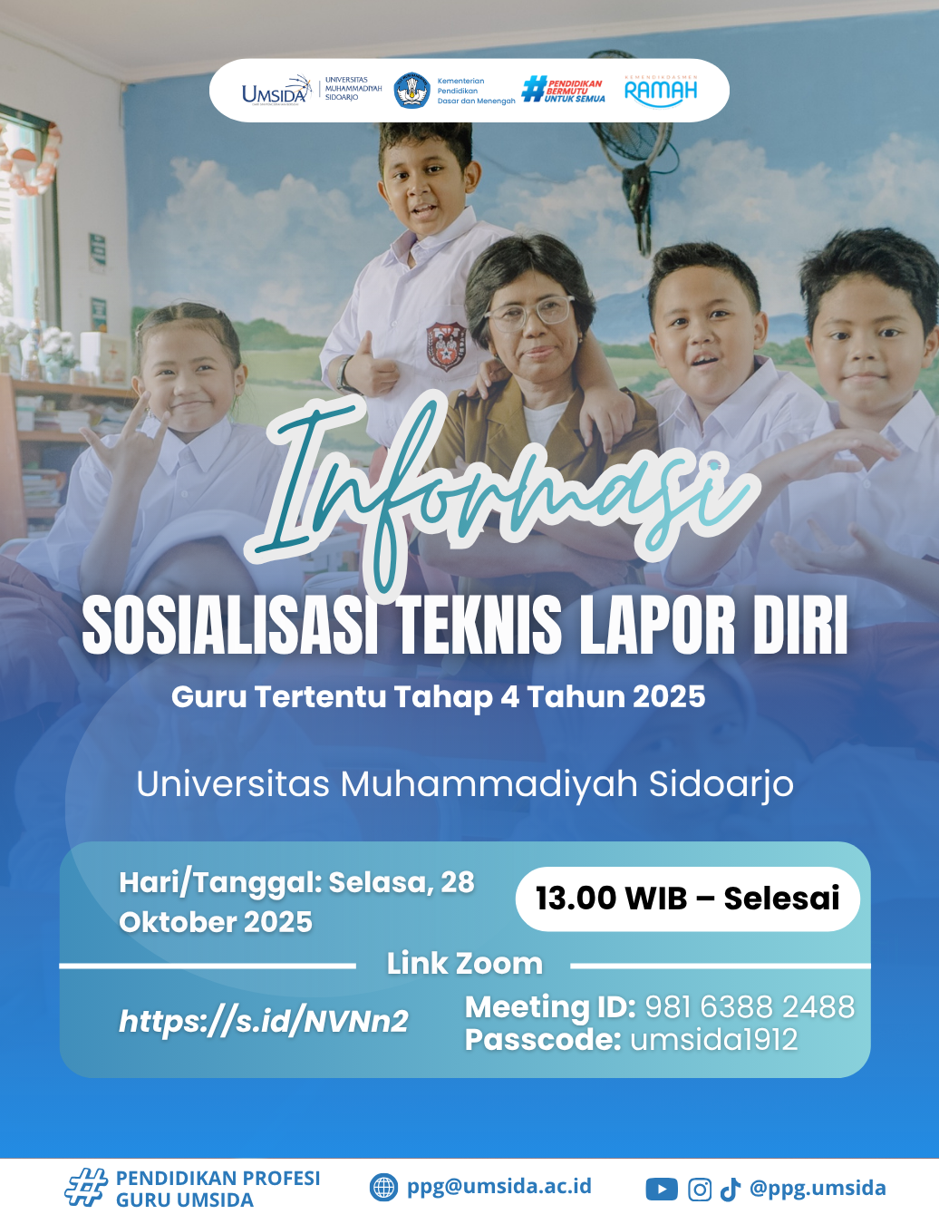 ppg.umsida.ac.id  — Program Studi Pendidikan Profesi Guru (PPG) Universitas Muhammadiyah Sidoarjo (UMSIDA) menyelenggarakan Sosialisasi Pelatihan Pembelajaran Tahap 2 bagi Calon Dosen dan Guru Pamong PPG pada 22 Oktober 2025. Kegiatan ini dilaksanakan secara daring dan diikuti oleh calon dosen serta guru pamong dari berbagai bidang studi yang diproyeksikan terlibat langsung dalam pendampingan mahasiswa PPG. Sosialisasi ini menjadi...
