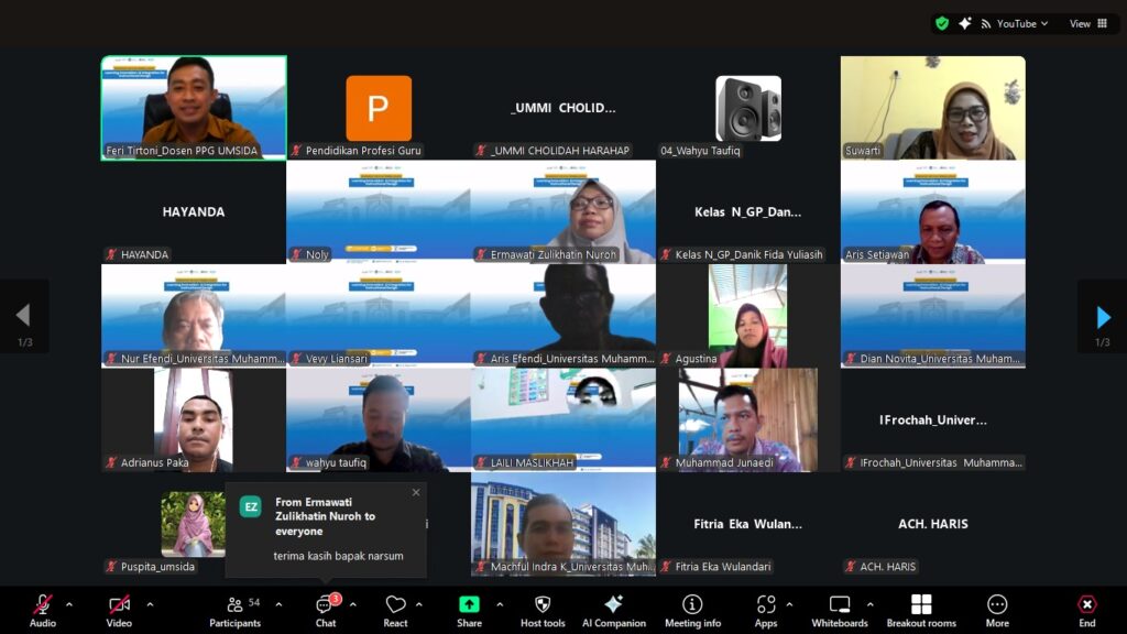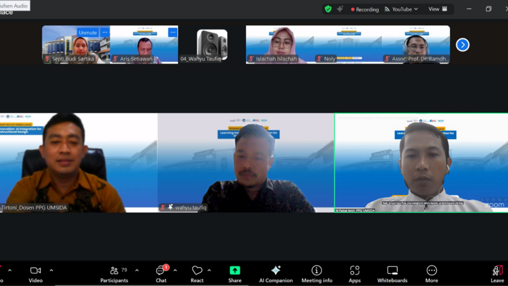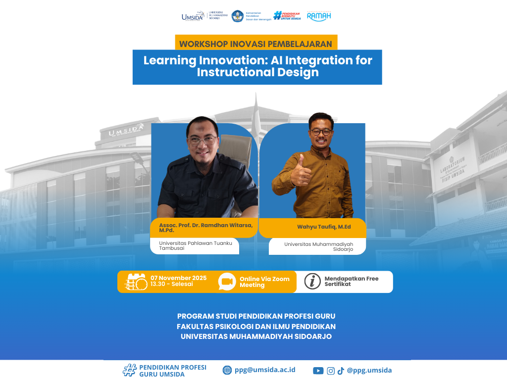 ppg.umsida.ac.id — Pendidikan Profesi Guru (PPG) Fakultas Psikologi dan Ilmu Pendidikan (FPIP) Universitas Muhammadiyah Sidoarjo (UMSIDA) menyelenggarakan Workshop Learning Innovation: AI Integration for Instructional Design pada Jumat, 7 November 2025 secara daring. Kegiatan ini diikuti oleh 90 peserta yang merupakan dosen dan guru dari berbagai daerah di Indonesia.